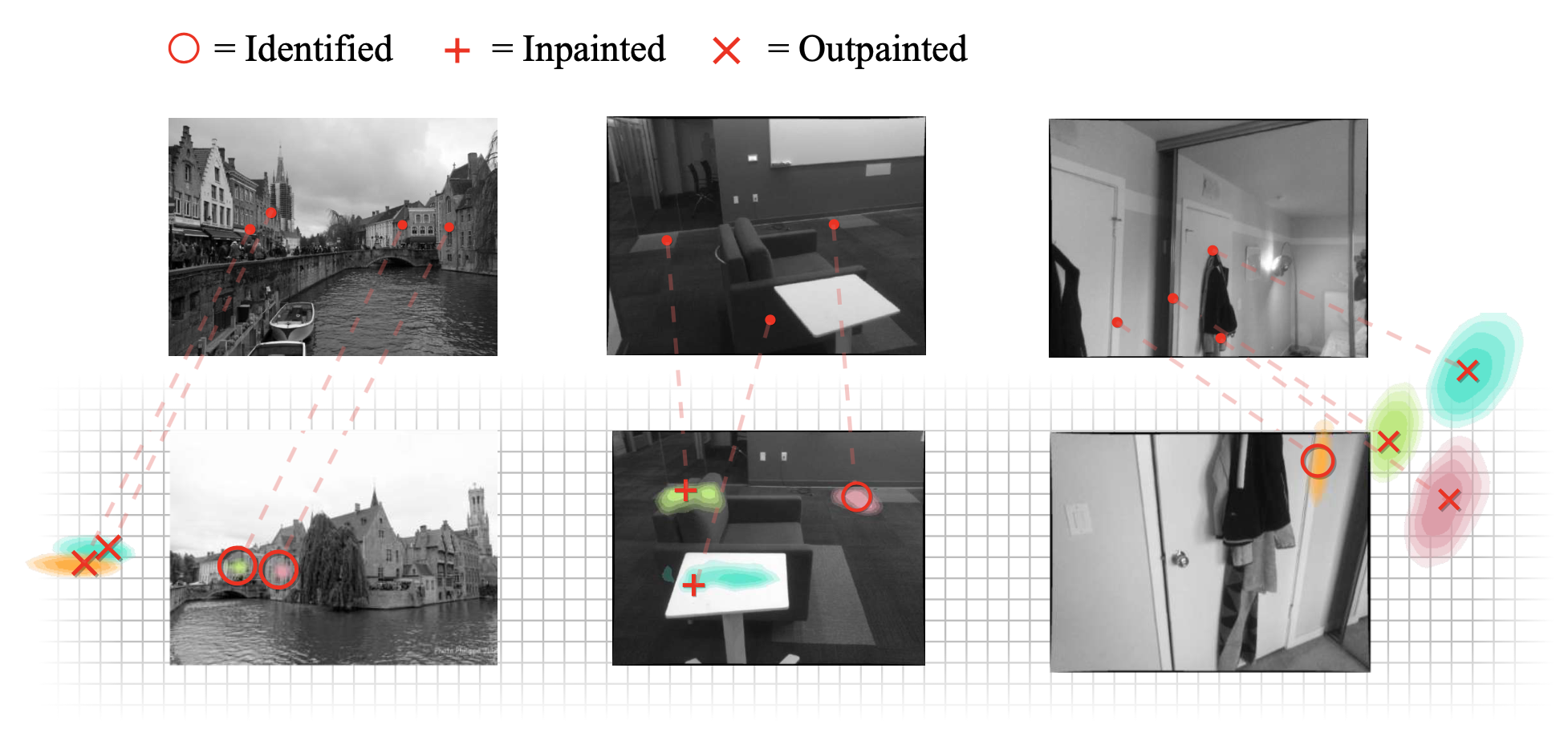Our network, called NeurHal, takes as input a pair of partially overlapping source/target images and keypoints, and outputs for each point a probability distribution over its correspondent’s location in the target image plane. When the correspondent is visible in the target image, its location can be identified. Otherwise, its location must be hallucinated. Two types of hallucination tasks can be distinguished: if the point is occluded, its location has to be inpainted; 2) if the point is outside the field of view, its location needs to be outpainted. We show the probability distributions predicted by our network on test images from ScanNet and Megadepth.
