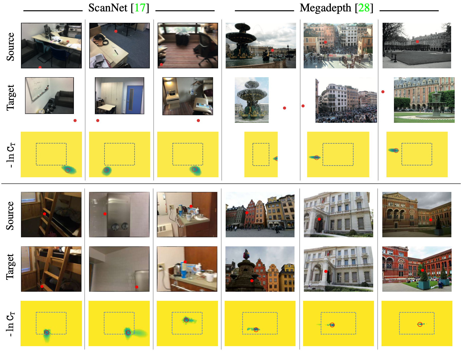 To illustrate the ability of NeurHal to perform visual correspondence hallucination, we display correspondence maps output by NeurHal on validation image pairs: (top row) outpainting examples, (bottom row) inpainting examples. In the source image, the red dot is a keypoint. In the target image and in the (negative log) correspondence map, the red dot represents the ground truth keypoint’s correspondent. The dashed rectangles represent the borders of the target images.